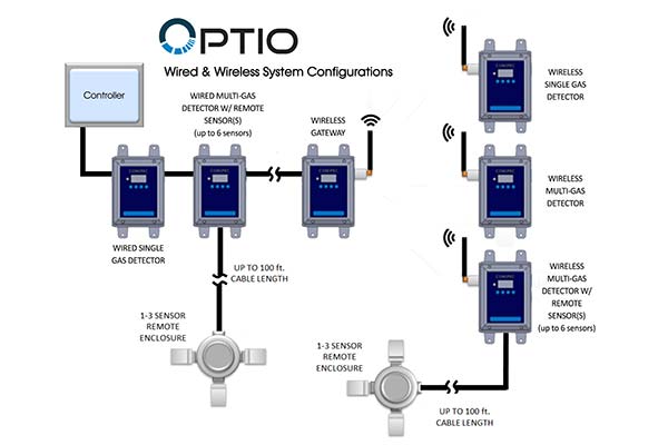 The OPTIO XP wireless multi gas detector provides detection coverage for up to 6 sensors and communicates wirelessly to an OPTIO XP configured gateway. The OPTIO XP gateway outputs consist of 4 dry relay contacts & Modbus RTU over RS-485 communications giving your wireless gas detection network the capability to control alarming or process systems. Optional remote sensors can be wired up to 100 ft. giving the detection system a huge coverage area when using multiple sensors.